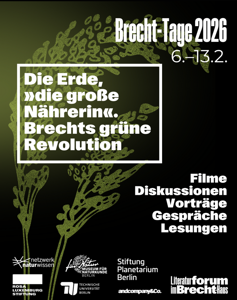 Vorwärts, nicht vergessen: die Erde, „die große Nährerin“! Die Brecht-Tage ’26 – ko-kuratiert von Alexander Karschnia – drehen sich um Brechts „grüne Revolution“. Ausgehend von seinen Texten zu Landwirtschaft, Technik und Gesellschaft schlagen Filme, Diskussionen, Vorträge, Gespräche und Lesungen einen Bogen zur Gegenwart: zur Klimakrise, zur industriellen Nahrungsmittelproduktion und zu neuen ökosozialistischen Perspektiven.Veranstaltung: NO EXIT, ONLY VOICE?