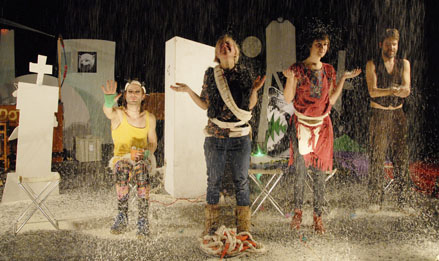 andcompany&Co. know what they did last summer: The went into the Polish jungle to look for a Western City called EL DORADO. The ‘golden city’ promises adventures like in the movies: Everything is allowed here, except not to have money! Who cannot pay shall not eat, but shall be eaten: “Tofu is human flesh, tell everybody!” While the red sun sinks behind the nuclear power plant, permanent campers pitch their tents on stage to pass the time around the camp fire or at the torture pole: Polish cowboys, East-German Indian impersonators and a nouveau-riche undertaker from Berlin-Neukölln. They read Karl May instead of Karl Marx, but behind the scenes the crisis is raging: In this western you can experience the state of things of tomorrow already today – beyond law and mercy. Capitalism is not over, it has just begun…