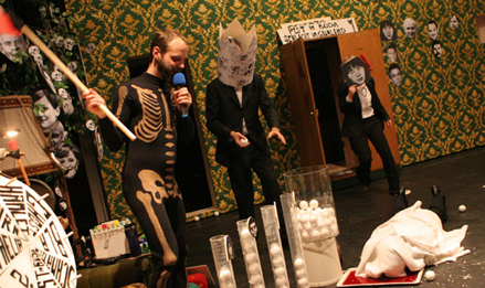 Im Selbstversuch wird Heiner Müllers „Hamletmaschine“ zu einem Spiel, dessen Einsatz der Text ist: „end of drama, begin of game“. Auf der Bühne steht ein Glücksrad, die Spielfelder entsprechen den fünf Akten, der Zufall bestimmt die Dramaturgie des Abends – und ein Showmaster, der die Texttreue der Spielenden auf die Probe stellt. Die Darbietung ist Konzert und kollektive Lektüre zugleich, Spaziergang durch den Text und Geisterfahrt durch die Geschichte: Hamlet, hin- und her gerissen zwischen Melancholie & Revolte in Ost-Berlin 1953, Budapest 1956, Stuttgart-Stammheim 1977: „Mein Drama, wenn es noch stattfinden würde, fände in der Zeit des Aufstands statt.“ Ophelia geistert durch das bürgerliche Wohnzimmer, in dem die Dinge allmählich außer Kontrolle geraten: Wände verschieben sich, Sofas greifen an, der Schrank wird zur Mördergrube, ein einsames Herz blutet vor sich hin und singt zum Abschied leise Servus. „Dänemark ist ein Gefängnis, zwischen uns wächst eine Wand. Sieh was aus der Wand wächst. Exit Polonius.“